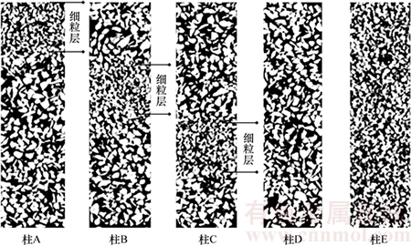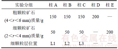 本实验中,共设有5个柱体,每个柱内的矿石添加量均为200 g。其中,柱A、柱B和柱C中均含有细粒矿石层,矿石粒径r满足2<r<4 mm,质量均为50 g,其余为粗粒矿石,4<r<6 mm,质量为150 g;柱D和柱E分别为粗颗粒或细颗粒组成的单一混合堆体,柱内矿石分布的具体方案,如表1所示。