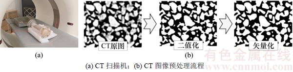 利用Adore Illustrator软件对CT灰度图像进行预处理,实现CT图像二值化与矢量化,为后续模拟的开展奠定基础。CT扫描装置及CT图像预处理流程,如图3所示。