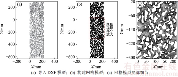 将DXF模型导入COMSOL Multiphysics模拟软件,通过转换为实体、分裂、差集和形成联合体、等操作,并且,控制序列类型为物理场控制网络,构建网格模型,如图4所示(其中X和Y分别为矿石散体柱所处模拟窗口的位置)。