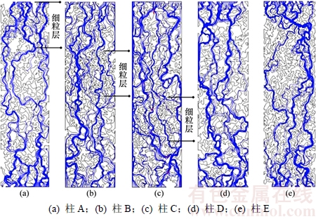 由图5可见:受矿石粒径、矿石形状及相邻矿石间的位置关系等多种因素的影响,溶液流动轨迹呈现不规则的自上而下延伸的汇集或分散状。当某处流线汇集时,表明孔隙内的溶液更倾向于流经此处,较易形成溶液优先流;反之,当某处没有流线或数量较少时,表明孔隙内的溶液不倾向于流经此处,该处孔道内溶液为非饱和流,溶液量较少,较易形成溶液流动盲区。细粒区域的流线分支数量和聚集程度明显比粗颗粒区域的小。在粗-细颗粒层和细-粗颗粒层的交界处,可以发现流线轨迹发生了显著变化,具体而言:在粗-细颗粒层交界处,小股的流线倾向于汇聚形成大股流线;在细-粗颗粒交界处,原有流线股倾向于分离形成若干小股流线,继续向柱体下部传递。并且,在粗-细(细-粗)颗粒层交界处,原有近竖直方向延展的流线存在水平方向的滑移现象。