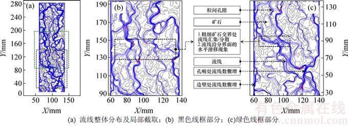 为更好地探究堆内局部的流线分布规律,以柱C为例,对柱内框选部分进行局部放大,如图6所示。其中,黑色线框上部为粗粒区,下部为细粒区,中部为粗-细交界处,见图6(b);绿色线框上部为细粒区,上部为粗粒区,中部为细-粗交界处,见图6(c)。