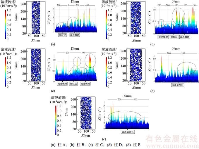 不同实验柱内溶液渗流速度场分布的俯视图与侧视图见图7,其中Z表示溶液渗流流速。由图7可见:各实验柱内溶液流速变化幅度不尽相同。进一步探究溶液流经细粒层至粗粒层交界面(细-粗颗粒层交界面)时的流速可知:柱A溶液流速自1.0×10-4 m/s增至1.8×10-4 m/s,柱B的溶液流速自0.45×10-4 m/s增至0.98×10-4 m/s,柱C的溶液流速自0.65×10-4 m/s增至1.40×10-4 m/s,溶液流速增幅显著。即:溶液在流经细-粗颗粒层交界面时,存在流速紊乱现象;经过细-粗颗粒层交界面后,溶液流速呈现明显骤增的趋势。图7(d)与图7(e)所示分别为利用粗颗粒矿石(2~4 mm)或细颗粒矿石(1~2 mm)的单一粒径的矿石堆体,对比二者可见:柱D溶液峰值流速较高,约为1.25×10-4 m/s;柱E溶液峰值流速较低,约为9.0×10-5 m/s,此外,图7(d)中的凸起明显比图7(e)中的多,表明柱D内溶液渗流速度场的紊乱程度明显比柱E的大。