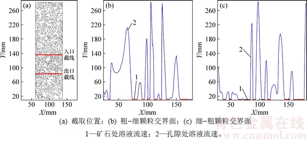 由图9可见:流速变化曲线的凸起对应溶液流动通道内的流速分布,曲线凸起的峰值对应通道中的孔喉,可见孔隙中溶液流速并不均匀,矿石对溶液流动起到阻碍作用,孔道中某点的溶液流速与矿石边壁的距离成反比,流速在孔喉处取得极大值[20]。此外,对比图9 (b)与9(c),前者溶液流速曲线凸起众多且优势凸起不显著,即溶液进入细粒区域前并不存在优先流或者优先流并不显著,流速分布不集中,溶液峰值流速达(2.4~2.6)×10-5 m/s;后者溶液流速曲线凸起数量变小,凸起的增幅变大,溶液的峰值流速达(3.0~3.2)×10-5 m/s,即溶液流速存在显著增加,形成溶液优先流并快速下渗。