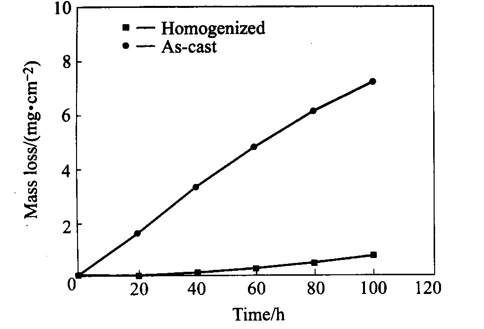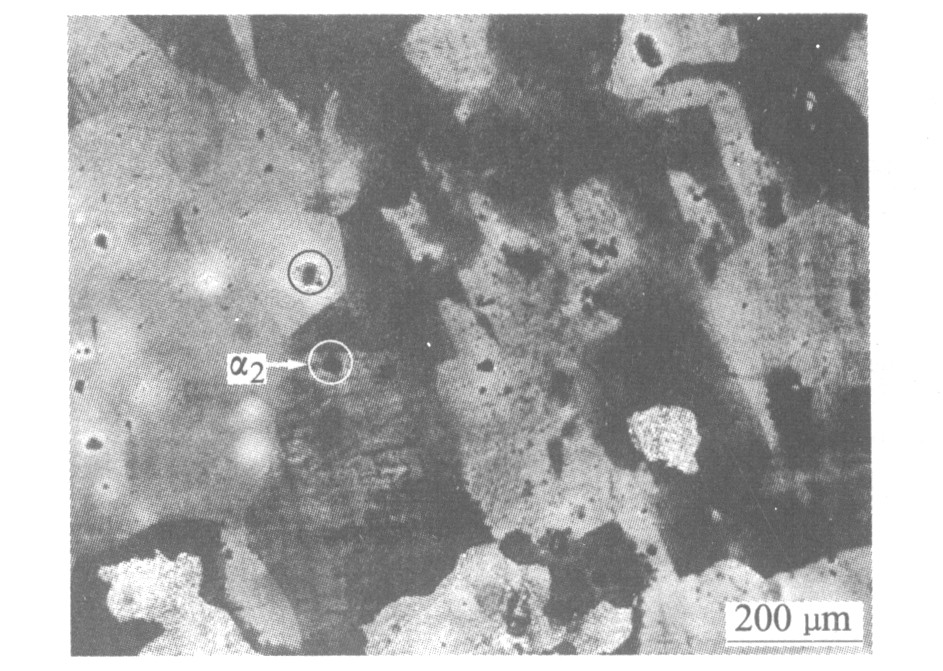 The hot corrosion behavior of as-cast and homogenized TiAl intermetallics was studied in (Na, K)SO4 mixed melts at 900 ℃, and the mechanism of the hot corrosion was discussed. The results show that microstructure of the homogenized TiAl is composed of uniform γ phase and some α particles. For the as-cast TiAl, however, its microstructure consists of 30% γ phase and 70% (γ+α2 ) lamellar structures. Hot corrosion resistance is high in the homogenized TiAl. The corrosion products are Al2O3. There is a layer of Ti sulfide on the interface between TiAl substrate and the corrosion products. The as-cast TiAl intermetallics is poor in hot corrosion property. α2 phase in the lamellar structure is corroded preferentially because of higher Ti element content in α2 phase. Corrosion product for the as-cast TiAl consists of Ti oxide and sulfide that can be easily peeled off from the substrate.