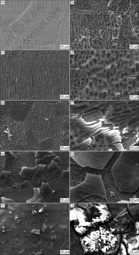 肉眼观察成膜10 s时试样表面无明显变化,呈现出锌镀层光亮银白色;成膜时间1 min后,试样表面转为浅灰色;5 min后试样表面灰色加深;而处理10 min后试样表面转为淡黄色;处理时间进一步延长,膜层的颜色逐渐加深;30 min以后膜层呈现出深黄色;处理时间进一步延长,膜层颜色没有明显变化。图1 所示为不同处理时间所获得的铈盐转化膜表面的SEM像,与文献[1]未加柠檬酸的常规铈盐转化膜相比较,可以看出两者存在着显著的不同。当处理时间为10 s时,可清晰观察到锌晶界(见图1(a))。当处理时间延长到1 min时,膜层均匀地覆盖整个基体,隐约可观察到锌晶粒的晶界(见图1(b))。裂纹是跨越晶界的、均匀分布,这说明转化膜在锌晶粒内部和锌晶界处的生长速度是基本一致的。当处理时间为3 min时,试样表面已经观察不到锌晶界,膜层表面更平整,并出现长条状的裂纹,裂纹取向基本一致(见图1(c))。当处理时间为5 min时,膜层均布表面裂纹成不规则网状分布,呈龟裂状(见图1(d)),裂纹变宽。当处理时间为10 min时,试样膜层整体连续完整(见图1(e)),但在微小局部区域开始出现上翘和脱落现象(见图1(f)),这可能是因为膜层增厚内应力增大的结果。而常规铈盐膜在处理时间小于10 min时,膜层在锌晶界处理快速生长并出现明显的翘起脱落,锌晶界一直可清晰观察[1]。当处理时间为30 min时,膜层的形貌变得与未加柠檬酸的常规铈盐膜相似[1],膜层不连续,膜层脱落现象较为严重,试样表面明显分成两层膜层,较厚膜层的较多区域已脱落,脱落处明显有新膜层形成(见图1(g)和(h))。当处理时间延长到60 min时,原来较厚的膜层绝大部分已经脱落,只剩下零星的膜层碎片,新生膜层已经布满整个表面(见图1(i))。当处理时间增加到240 min时,在转化膜表面局部附着一些白色球状颗粒,颗粒在膜层表面分布极不均匀,部分区域成团聚集,表面膜层高低不平,颗粒边缘模糊(见图1(j))。这与早期ARNOTT等[13]在铝合金上获得的铈盐转化膜以及热镀锌层改进型镧盐转化膜[2]有些类似。