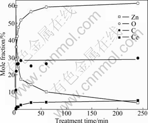对图1中不同处理时间所获试样表面作EDS分析,各元素含量随处理时间变化曲线如图2所示。由图2可见,在较短的处理时间(10 min)内,随着处理时间的延长,膜层中Zn含量快速减小而C、O及Ce含量迅速增加,表明膜层在初期反应迅速;当处理时间大于30 min,膜层中Zn含量减小及O、Ce含量增加趋缓,表明膜层虽然随着处理时间持续增厚但生长较慢。而膜层中的C含量基本保持不变。