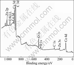 图3所示为采用XPS表面分析技术对处理时间为1 min、试样刻蚀20 s获得的元素全谱图。由图3可 知,整个转化膜主要含有O、Zn、C、Ce 4种元素。
