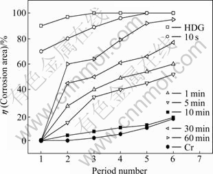 图6所示为中性盐雾测试结果。由图6可知,未经处理的热镀锌试样(标记为HDG)经过一个周期的喷雾,白锈面积就已经接近100%;经成膜溶液处理10 min左右的试样,经中性盐雾腐蚀3周期以上白锈面积仅为5%,这与铬酸盐钝化膜(标记为Cr)相当。处理时间为30和60 min的试样经过两个周期的喷雾之后,白锈面积大大增加,主要是由于外层较厚的膜层出现大量脱落。综合耐蚀性、附着力以及经济方面的考虑,认为处理10 min左右得到的转化膜最优,此时膜层较厚且仅细微处脱落,对膜层耐蚀性没有显著影响。