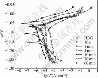 图7 处理不同时间的铈盐转化膜与未经处理的热镀锌层在5% NaCl溶液中的塔菲尔极化曲线