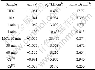 不同处理时间的试样与未经处理的热镀锌试样的塔菲尔极化曲线见图7。从图7可知,与未经处理的HDG试样相比,经过成膜溶液处理,试样极化曲线的阳极分枝与阴极分支均向低电流密度的方向偏动,但阳极分支偏动幅度较小,而阴极分支偏动幅度较大。由此可见,铈盐转化膜能够同时抑制腐蚀反应的阳极过程和阴极过程,主要抑制了阴极过程,从而有效地抑制了整个腐蚀反应。表1所列为图7中极化曲线经过电化学工作站自带处理软件拟合所得的相关电化学腐蚀参数。由表1可知,与未经处理的HDG试样相比,经铈盐钝化液处理10 min的试样的极化电阻提高了40多倍,腐蚀电流密度液降低了2个数量级;而与常规铈盐膜[17]相比,极化电阻提高了约4倍,腐蚀电流密度则降低为常规铈盐膜的1/10,由此可见,添加柠檬酸可以提高铈盐转化膜的耐蚀性能。