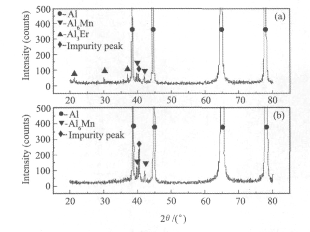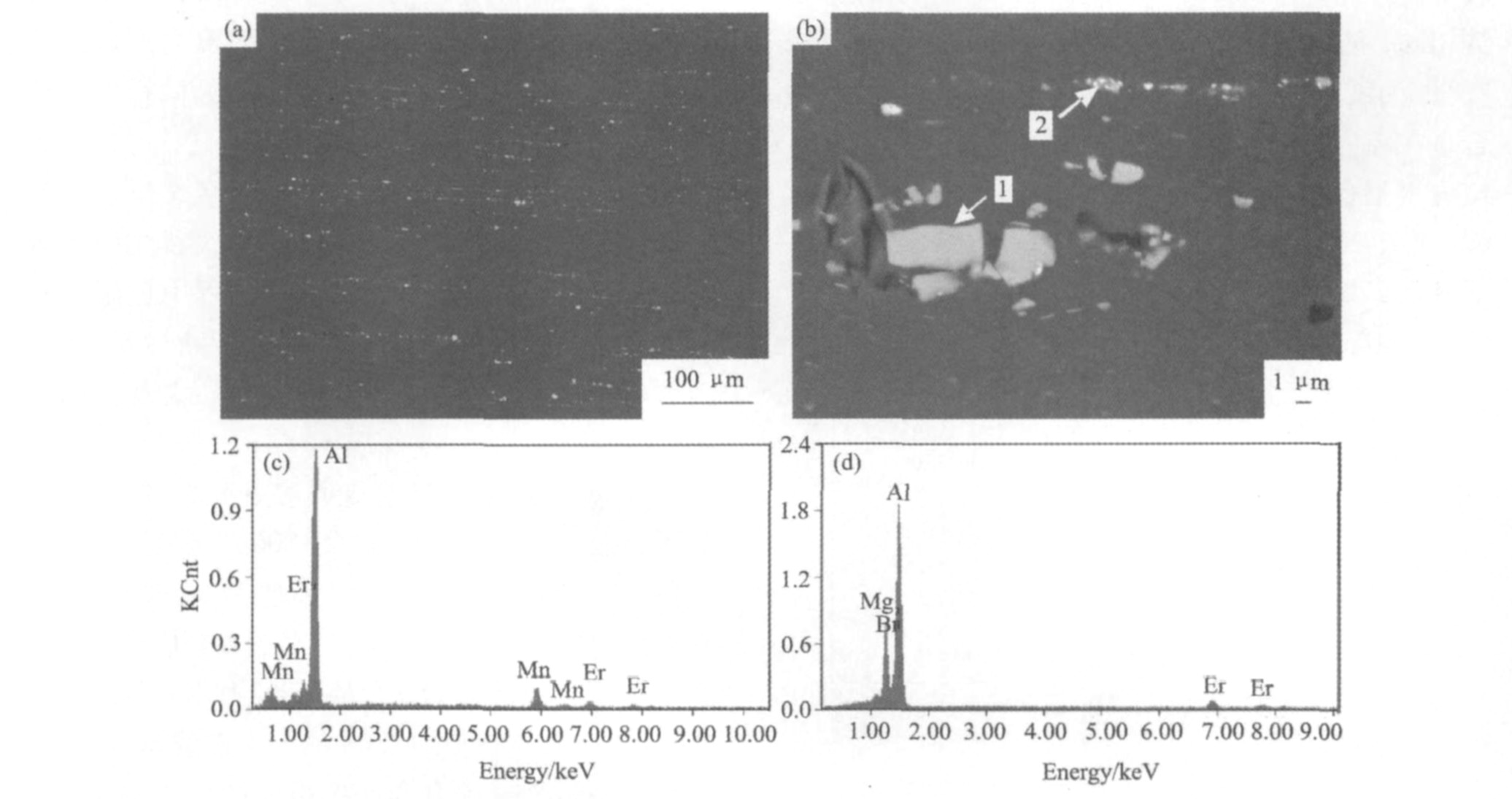, Al3 Er粒子在铝合金中主要以两种方式析出。 第一种是合金凝固时从液相中直接析出, 为一次析出粒子, 粒子达到微米级, 并随着Er含量的增加, 一次Al3 Er粒子含量增加。 第二种是过饱和固溶体在热处理及热加工过程中析出的弥散分布Al3 Er粒子, 为二次析出。 这些粒子一般为球状或豆瓣状, 尺寸一般在几个纳米到几十纳米。 由于二次析出Al3 Er粒子尺寸很小, 一般在透射电镜中才能观察到。 图2观察到的Al3 Er粒子一般都是粗大的一次析出相。