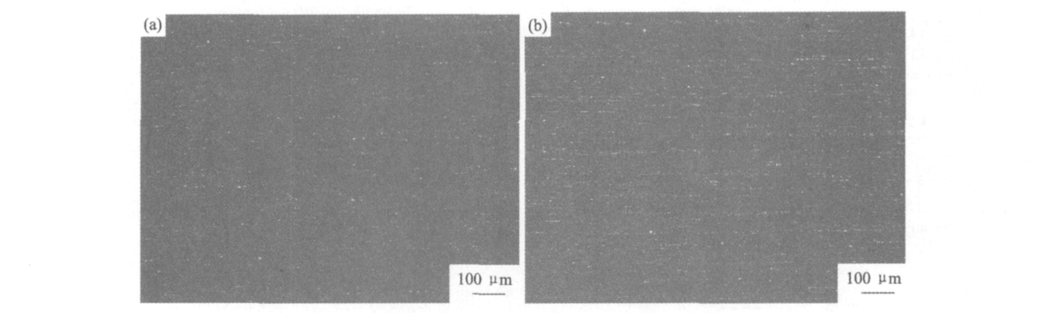 图3为两种实验合金的扫描背散射电子像。 从图中可以看到, 5E83与5E06都析出了粗大Al3 Er相, 而图1 (b) 中并未显示5E06有Al3 Er峰, 这表明Er含量小于0.2%时, 合金中所含的Al3 Er相较少难以被检测出来。 图3 (a) 显示, Er含量为0.2%时, 第二相沿轧向成断续点状分布。 而图3 (b) 中看到, Er含量为0.4%时, 沿轧向分布的第二相明显增多并呈连续线状分布。 由于本实验两种合金中Mn元素含量相当, 所以析出的第二相粒子Al6 Mn含量相差不大, 所以图3中第二相含量的差异应该是由一次析出的Al3 Er粒子引起的。