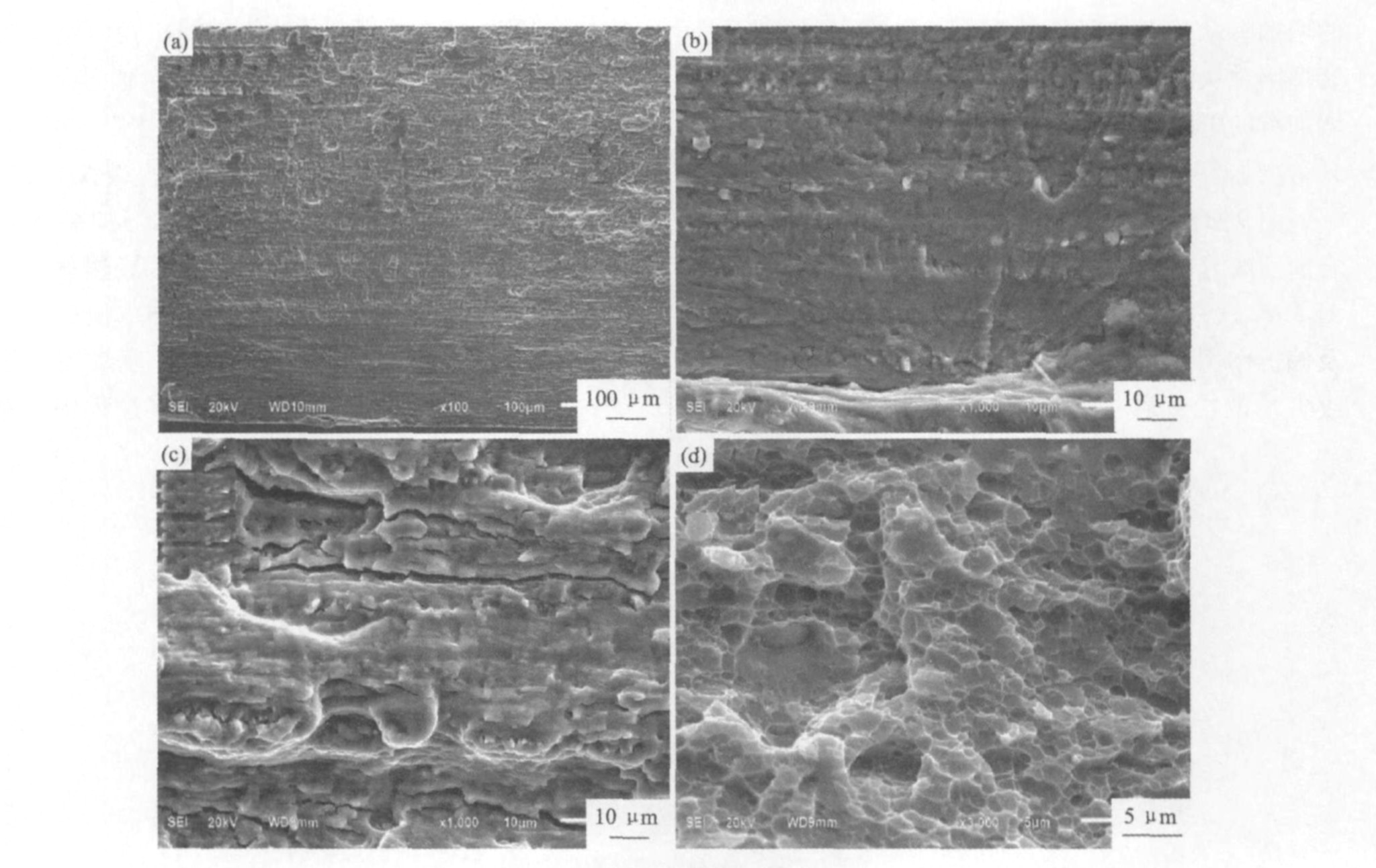 : 滑移带开裂、 晶界或孪晶界开裂、 夹杂物或第二相与基体的界面开裂。 基于滑移带开裂的裂纹一般萌生于试样表面, 这是因为裂纹的萌生首先在范性变形的集中处开始, 而范性变形由自由表面开始。 且根据源区的放大图5 (b) , 发现在源区并未含有夹杂物或第二相。 因此可以推断5E06合金以滑移带开裂机制萌生裂纹。 5E83合金遵循同样的裂纹萌生形式。 图5 (c) 为疲劳断口扩展区, 可以看到大量的撕裂棱和二次裂纹。 较小的微裂纹内还清晰的看见大量的第二相, 而大的二次裂纹内则未发现有第二相, 可能是裂纹扩展过程中逐渐变宽致使第二相脱落了。 图5 (d) 为疲劳断口瞬断区, 由大量形状大小较一致的韧窝构成, 表现为明显的韧性断裂。