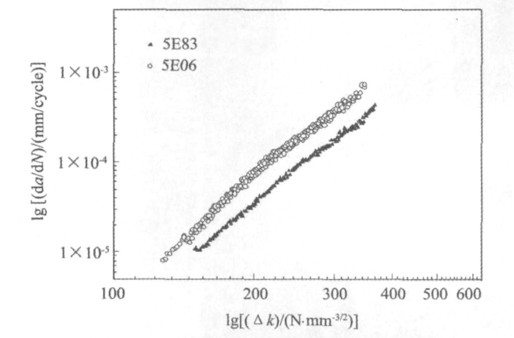 Fig.6 Fatigue crack propagation rate curves of 5E06 and 5E83 alloys