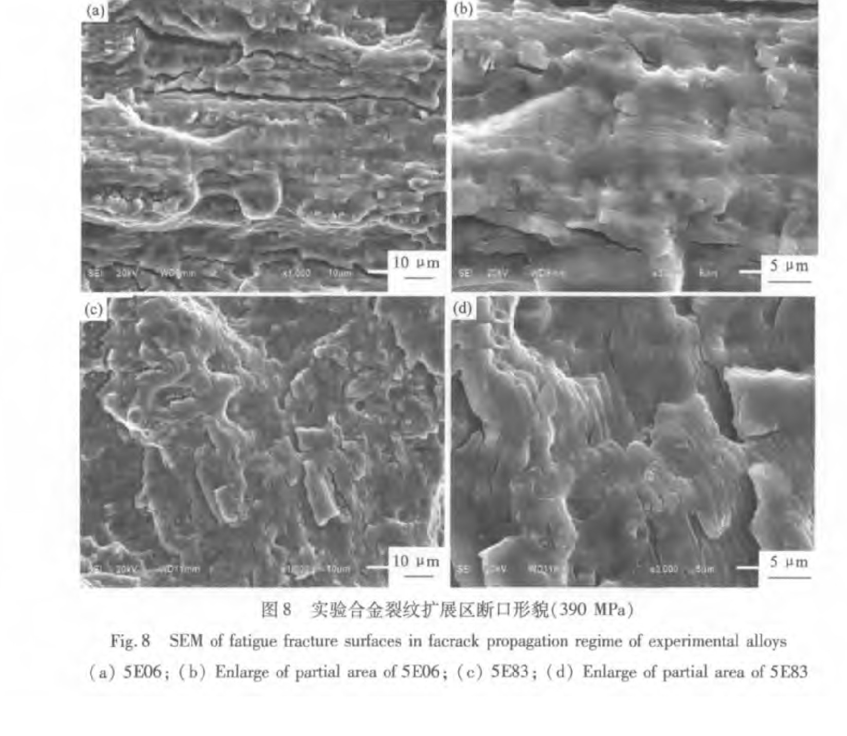 , 裂纹基于裂纹尖端的塑性变形而扩展。 Mg的增加有助于抵抗材料的变形, 使裂纹尖端塑性变形困难从而阻碍裂纹的扩展, 这表明Mg含量的增加有助于减缓裂纹的扩展。 断口上表现为随Mg含量增加, 疲劳辉纹间距减小。