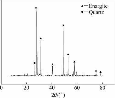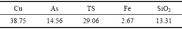 实验所用硫砷铜矿纯矿物标本采自福建某矿山,矿物经过破碎、镜下挑选、细磨、筛分、表面处理、真空干燥后得到纯矿物粉体并密封保存待用。矿物主要元素分析结果见表1,XRD分析结果见图1。
