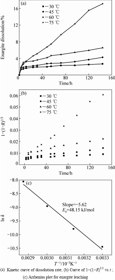 在初始Fe3+浓度30.5 g/L、Fe2+浓度0.02 g/L、初始pH 1.0、搅拌速度200 r/min、不同温度(30、45、60 和75 ℃)实验条件下,对混合矿物(硫砷铜矿与黄铁矿配比为1:6)进行浸出动力学实验,浸出过程中溶液电位维持在(850±5) mV。不同温度下硫砷铜矿溶解动力学曲线如图3(a)所示。根据不同温度下得到的矿物浸出分数R,作1-(1-R)1/3(R为矿物浸出分数)与时间t的关系曲线,如图3(b)所示。计算不同温度下直线的斜率即k,再作lnk对1000/T(T为热力学温度)曲线,如图3(c)所示。