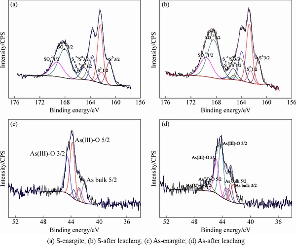 对硫砷铜矿纯矿物、混合矿(硫砷铜矿与黄铁矿配比为1:4)化学浸出渣分别进行XPS分析,浸出前后硫砷铜矿表面的XPS分析结果如图5和表2所示。分析结果表明,由于自旋轨道分裂,S 2p峰出现双峰 (S 2p3/2和S 2p1/2),S 2p3/2峰的强度为S 2p1/2的两倍(见图5(a)和5(b)),结合能高出1.19 eV(见表2)。此外,在164.0 eV时元素S与多硫化物重叠(见图5(a)和5(b))。浸出前后表面S物相存在差异:浸出前矿物表面未检测到亚硫酸盐,浸出后表面生成少量亚硫酸盐,硫酸盐增加。