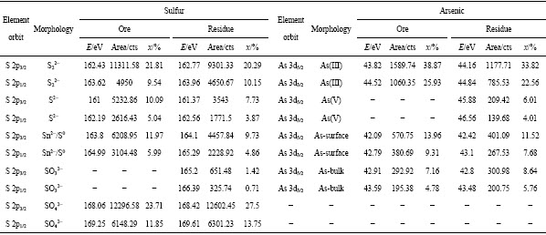 对硫砷铜矿纯矿物、硫砷铜矿与黄铁矿配比(质量比)为1:4时的化学浸出渣分别采用XPS(X射线扫描微探针电子能谱仪,Quantum 2000,Physical electronics 公司,美国)进行测试分析。