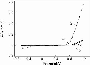 在硫砷铜矿的电化学以及浸出原电池效应方面,始终存在着争议。硫砷铜矿与黄铁矿混合浸出体系中,一些观点认为混合浸出加速了硫砷铜矿的浸出[7-8, 13],而另一种观点则认为加速了黄铁矿的溶解[9, 11]。在硫砷铜矿和黄铁矿混合高温硫化焙烧后浸出的实验中发现铜的溶解比纯硫砷铜矿浸出要快[7]。在硫砷铜矿压力浸出条件下,添加黄铁矿促进硫砷铜矿的溶解,生成的三价铁是促进硫砷铜矿溶解的重要原因[8]。但是,一些报道称,在黄铁矿和硫砷铜矿混合矿生物浸出过程中黄铁矿先于硫砷铜矿浸出。CANALES等[9]研究生物连续氧化处理含黄铁矿和硫砷铜矿的金精矿时发现,浸出的主要对象是黄铁矿,硫砷铜矿变化不大。LEE等[11]研究辉铜矿、硫砷铜矿和黄铁矿3种不同类型的混合矿物浸出时发现,在硫砷铜矿的浸出渣表面出现了一些空洞,经检测是辉铜矿和黄铁矿浸出后产生的,认为在混合矿样中,辉铜矿和黄铁矿先于硫砷铜矿被分解浸出。目前有关硫砷铜矿原电池效应的研究中,大多数研究是在热压浸出、焙烧浸出或者生物浸出条件下进行的,且未测定硫砷铜矿的静止电位,未能为相关理论提供电化学依据。硫砷铜矿的电化学特性、硫砷铜矿和黄铁矿混合化学浸出中的原电池效应有待进一步研究。
