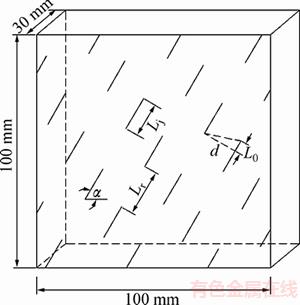 试验中的遍布节理闭合试样由水泥砂浆材料浇筑而成。白水泥、细砂、水按体积比2:1:1配置试验用水泥砂浆,在室温下浇筑到磨具中成型。试样高×宽×厚为100 mm×100 mm×30 mm,其中预制节理采用内插云母片制成,云母片厚度为0.6 mm。试件几何参数及节理分布如图1所示。其中:L0为节理重叠长度,mm;Lr为节理间岩桥长,固定取20 mm;Lj为节理长度,固定取15 mm;d为节理间距,固定取15 mm;α为节理倾角,(°)。试样中设置4种不同节理重叠长度(L0为15,10,5和0 mm 4种),每种重叠长度节理设置6种不同倾角(倾角α为0°,30°,45°,60°,75°和90°),试样节理倾角变化遵循平行转动的规律。