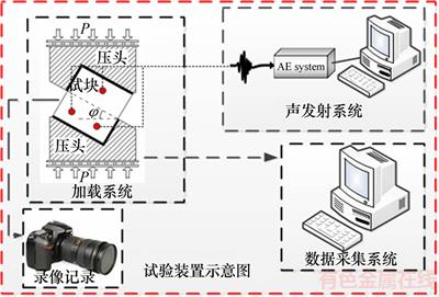 试验研究采用倾斜压模剪切法,固定压剪角为45°。试验加载仪器采用高精度微机控制电液伺服试验机,采用位移控加载方式,速度为0.1 mm/min。在试验过程中,采用高清数码相机记录试件表面破坏过程,采用声发射监测试样的内部破坏过程,以便于后期对试件破坏进行分析,试验装置示意图如图2所示。