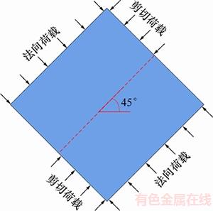 预制节理对试样破坏行为具有重要作用,当荷载作用在单裂隙类岩石材料上时沿着原有裂隙会发育2种类型的裂隙(见图3):拉伸裂纹和次生裂纹,次生裂纹根据沿节理面不同方向发育分为类平面次生裂纹和斜次生裂纹[6]。本文研究的压剪荷载可分解为沿试样中部平面的剪切荷载和沿上部加载的单轴压缩荷载(见图4),且在45°压剪角下剪切荷载与轴向压缩荷载相等。