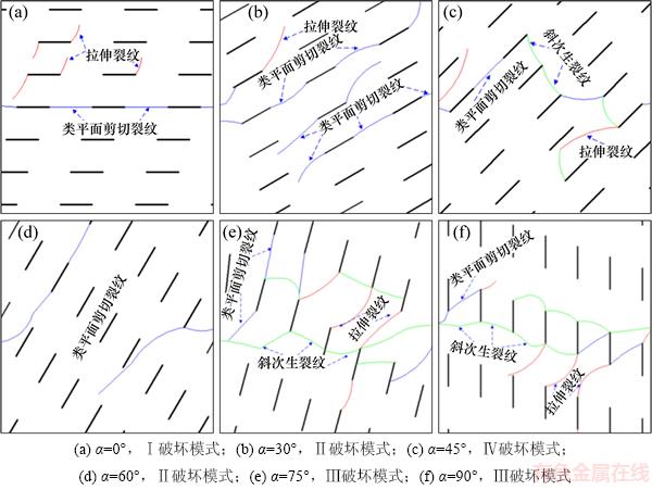 当平行节理倾角α=0°时,图5(a)所示随着试样加载,在轴向压应力作用下试样左上部节理尖端先产生拉伸翼裂纹,随着荷载增强翼裂纹以断裂角70.5°向轴压荷载方向扩展,这符合经典断裂力学中有关翼形裂纹扩展的解析结果[17]。但随着荷载不断增大,剪切应力主导试样破坏,翼裂纹扩展没有得到延续且呈现出缓慢闭合的趋势,而试样中部剪切应力面与节理面共面两端节理先产生裂隙、进而克服两端岩桥使裂隙扩展,最终试样沿着共面完全贯通导致试件整体破坏。这种沿着节理面、剪切应力作用面进行裂隙扩展、贯通的平面剪切破坏的模式为共面剪切破坏模式(Ⅰ破坏模式)。这种模式由于剪切应力面与节理面共面以及剪切荷载与轴压荷载相等情况下先剪切破坏,因而这类试样的破坏路径是可以预判的,沿该共面贯通剪切破坏。