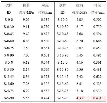 节理试样进行压剪试验,节理试样的峰值剪切强度及其对应位移如表2所示。