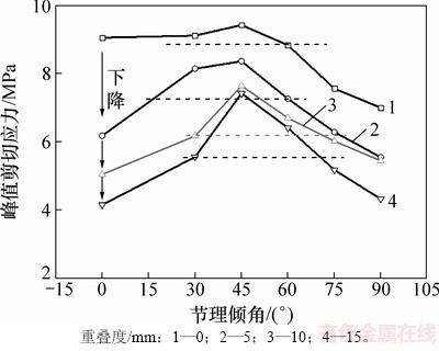 2) 试样峰值剪切强度随倾角增加先增大后减小且在45°取得最大值;随着节理重叠度的增大,峰值剪切强度逐渐减小。节理重叠度越大(峰值剪切强度越小),峰值剪切强度随倾角变化幅度越大;剪切峰值强度对倾角因素更敏感,但随着节理重叠度的不断减小重叠度对峰值剪切强度的影响不断增强。
