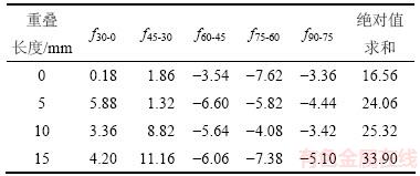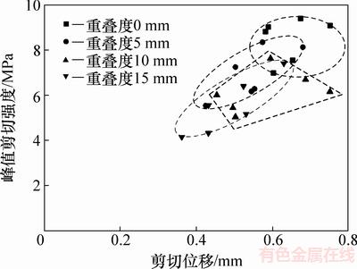观察不同重叠度试样的峰值剪切强度分布(图10)明显发现其点分布看似杂乱无章,但也呈现一定的规律,重叠长度为0 mm的试样整体上位于右上角、重叠长度为15 mm的试样位于左下角,峰值剪切强度及峰值位移都随重叠度的增大呈现整体上减小的趋势。