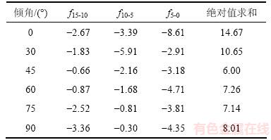 试验数据按照式(1)处理,得到倾角变化引起峰值剪切强度的改变斜率见表3。对表3数据进行绝对值处理可以得到:倾角对峰值剪切强度的影响斜率范围为0.18~11.16,其斜率所有数据绝对值后均值为4.992;倾角斜率的绝对值求和数值随重叠度的增加而增大,其表明节理重叠度越大(峰值剪切强度越小),峰值剪切强度随倾角变化幅度越大。