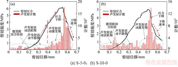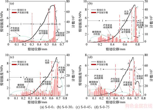 3) 剪切应力-位移全过程曲线结合声发射计数特征从试样受载直到破坏可划分为4个典型的阶段:微裂隙闭合阶段、弹性阶段、裂隙扩展直到破裂阶段和破裂后阶段。不同倾角试样的剪切应力-位移曲线差异主要体现在破裂后阶段,相同破坏模式的试样曲线形态相似。