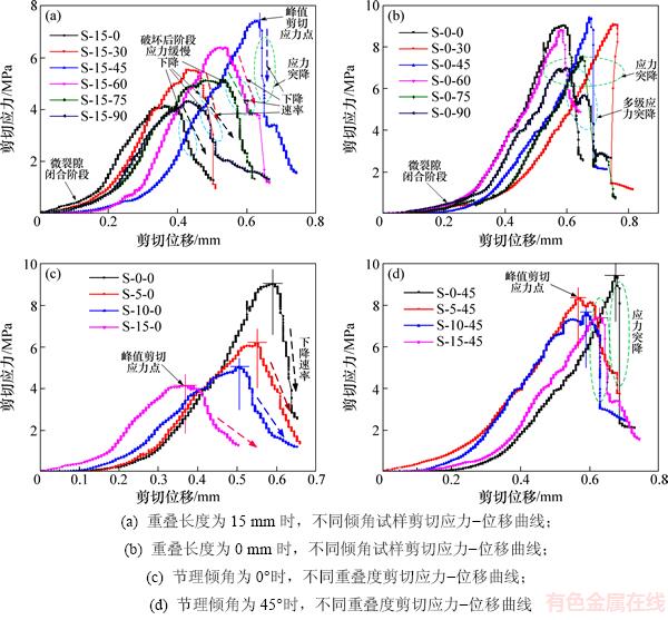 不同重叠度试样的剪切应力-位移曲线(图8)可以发现:重叠度越小的试样其峰值剪切强度越大,峰值剪切位移也越大;不同重叠度试样曲线变化形态相似,但曲线斜率随重叠度变化而变化(尤其破坏后阶段)。节理倾角为0°的试样(见图8(c)),不同重叠度试样其曲线变化平缓,破坏后曲线渐进式下降,重叠度越小其下降速率越快。节理倾角为45°的试样(见图8(d)),破裂后阶段具有明显的应力突降,重叠度越小应力突降值相对越大。