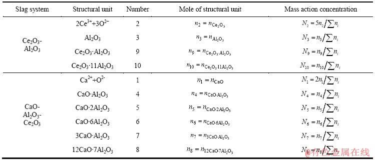 Table 1 Expression of structural units, their mole numbers and mass action concentrations of Ce2O3-Al2O3 and CaO-Al2O3-Ce2O3 slags at metallurgical temperature based on ion and molecule coexistence theory