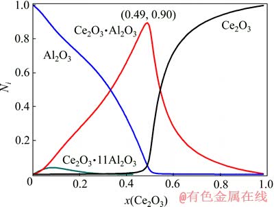 图1所示为在1 873 K下Ce2O3-Al2O3二元系中各组元的作用浓度与Ce2O3摩尔分数的关系。从图1中可以看出:由于Ce2O3和Al2O3有较强的结合形成Ce2O3·Al2O3的能力,当Ce2O3的摩尔分数在0.49时,Ce2O3·Al2O3的作用浓度达到最大值0.90,使得Al2O3和Ce2O3的作用浓度均达到较低水平。然而,当Ce2O3的摩尔分数大于0.5时,Ce2O3的作用浓度急剧增加;当Ce2O3的摩尔分数小于0.5时,Al2O3的作用浓度迅速上升。