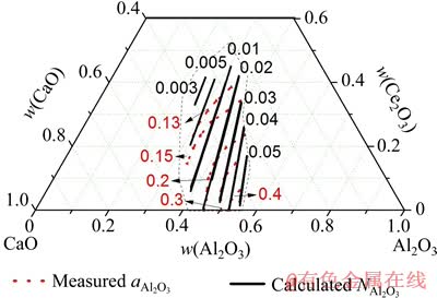 图2 1 773 K时CaO-Al2O3-Ce2O3三元渣系中计算的等Al2O3作用浓度线和测量的等Al2O3活度线