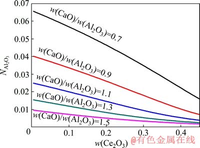 图3所示为Al2O3的作用浓度随w(CaO)/w(Al2O3)和Ce2O3含量的变化规律。即Ce2O3含量一定时,随着w(CaO)/w(Al2O3)的增加,Al2O3的作用浓度降低;同时,保持w(CaO)/w(Al2O3)不变,Al2O3的作用浓度随Ce2O3含量增加而降低。另外,Ce2O3含量一定时,w(CaO)/w(Al2O3)从0.7增大到0.9时,对Al2O3的作用浓度的影响比w(CaO)/w(Al2O3)从0.9增大到1.1对Al2O3的作用浓度的影响要大。考虑到w(CaO)/w(Al2O3)值对精炼渣流动性能的影响,可选择一个适当的w(CaO)/w(Al2O3)值。