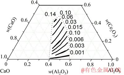 decreases with the increase of w(CaO)/w(Al2O3) at a certain content of Ce2O3 and with the increase of Ce2O3 content at a certain value of w(CaO)/w(Al2O3)。Moreover, the iso-curves