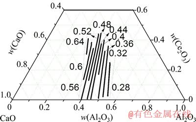 图5所示为1 773 K时CaO-Al2O3-Ce2O3中等CaO作用浓度线。由图5中观察可知:当w(CaO)/w(Ce2O3)一定时,Al2O3含量升高,CaO作用浓度减小;CaO含量一定时,CaO的作用浓度随着w(Ce2O3)/w(Al2O3)的增大而增大。