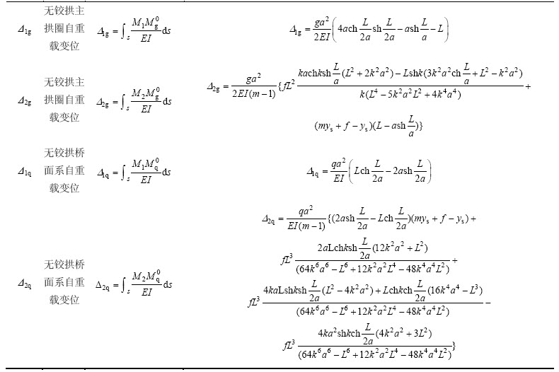 超静定拱力法方程中包括大量载变位积分,也可以使用近似积分原理完成实用公式的推导,进而得到悬链线拱内力的实用表达式,如表2所示。
