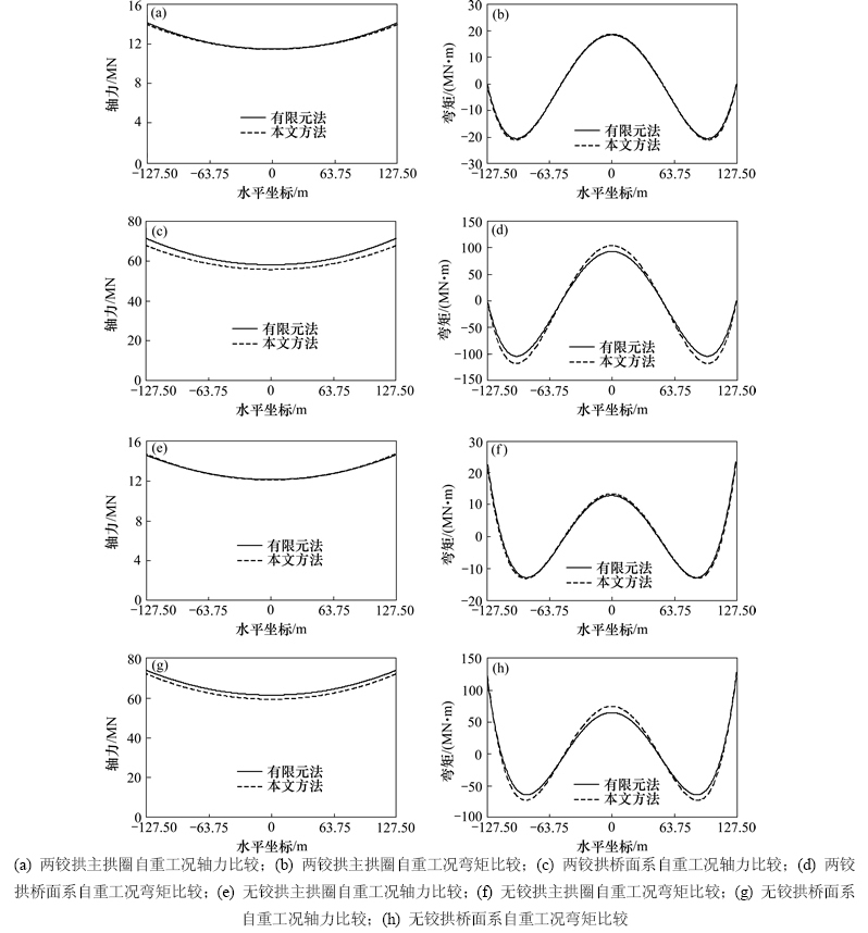 从图3可以看出:本文方法的内力结果与有限元法所得结果基本吻合。其中,两铰拱主拱圈自重工况轴力最大相对误差为0.96%,弯矩极值最大相对误差为2.53%;两铰拱桥面系自重工况轴力最大相对误差为4.81%,弯矩极值最大相对误差为11.67%;无铰拱主拱圈自重工况轴力最大相对误差为1.08%,弯矩极值最大相对误差为4.84%;无铰拱桥面系自重工况轴力最大相对误差为2.11%,弯矩极值最大相对误差为11.55%。本文方法所得轴力结果最大相对误差不超过5%,弯矩极值最大相对误差不超过12.00%,表明本文实用解析解具有较高的精度。从图3还可以看出:在两铰拱与无铰拱中主拱圈自重工况比桥面系自重工况的内力相对误差小,表明本文方法对主拱圈自重工况有着更广泛的适应性。