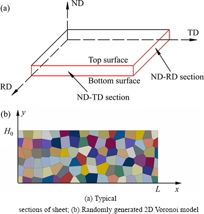 多晶体几何模型的建立方式包括扩展Taylor模型、用规则多边形或多面体代替晶粒以及结合Voronoi图的结构与算法来建立等[17]。研究者通常以正六边形或者以每个有限元单元[18]来建立多晶体CAE分析模型。图1所示为有限元分析模型示意图,其中图1(a)所示为板材截面示意图,图1(b)所示为一个随机建立的二维Voronoi模型用于表示多晶体材料的微观结构[19],其中不同颜色代表不同的晶粒。图1(b)所示的二维微观几何模型就代表了图1(a) 中所示的二维截面,如ND-RD截面。本研究中所用的材料微观参数如表1所列[20]。