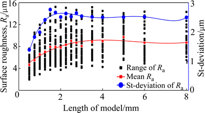 Fig. 2 Variance of model surface roughness(Ra) and st-deviation with model length (average grain size 70 μm)