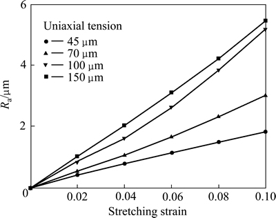 以单向拉伸为例进行模拟分析。基于2.2节所确定的有限元分析模型尺寸建立晶粒尺寸为45、70、100和150 μm的模型并沿RD方向拉伸,其初始粗糙度为0,拉伸应变为0.1。为了减小晶粒取向对表面粗糙度的影响,每种晶粒尺寸下进行多次分析,每次分析都重新随机的赋予晶粒取向,将所得结果求平均值后绘出如图4所示的表面粗糙度Ra随应变的变化曲线。