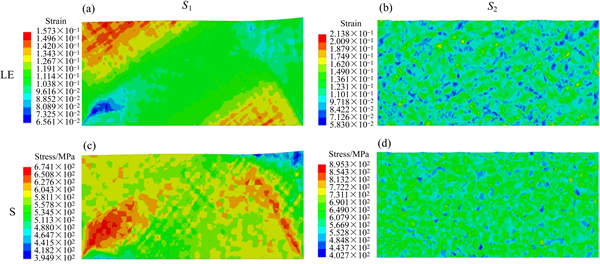 Fig. 9 Strain((a), (b)) and stress((c), (d)) contours for S1((a), (c)) and S2((b), (d)) under in-plane pure shear