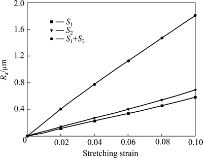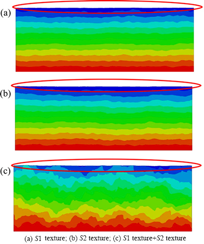 通过图10~12可以看出,单独的S1和S2织构经过拉伸后的表面起伏较小,而二者结合之后的表面轮廓起伏严重,但其粗糙化速度随应变的增加大致是保持一致的。因此,基于以上的分析可知,不同织构剪切趋势的差异会使表面粗糙化更加严重。