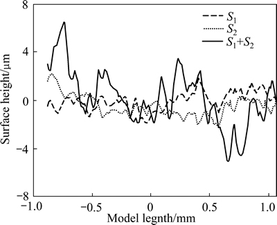 此外,织构之间剪切趋势的差异也会对表面质量产生影响。将不同织构进行组合然后模拟分析,其结果如图10所示。由于沿着RD拉伸会减弱剪切趋势的影响[5],为了更好地分析剪切趋势与表面质量的关系,图10的分析都是在单向拉伸下沿着TD方向进行的。图10所示为对单一的S1和S2织构以及S1和S2的混合织构拉伸后的位移云图。图11所示为3种织构组合变形后的表面轮廓图。图12所示为3种模型所得粗糙度随应变的变化曲线。