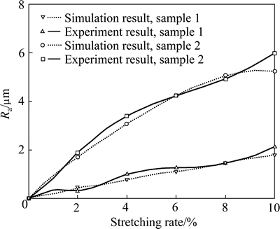 从图16可以看到,模拟与实验得到的表面粗糙度随拉伸变形量的变化趋势基本一致,考虑到二维模型的局限性以及测量误差等原因,实验与模拟结果吻合良好。