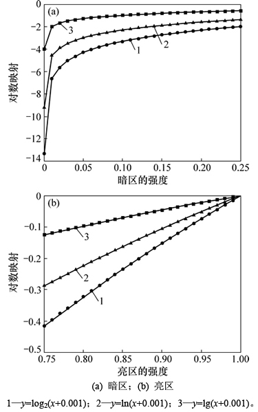 但是文献[10]采用固定的对数底进行处理,会导致处理后图像亮区和暗区的细节丢失。为了使输入的灰度级[0,1]在对数变换输出实现图像灰度级映射的合理变化,应当构建不同底数的对数函数,图1所示为不同底数的对数映射曲线。从图1可以看出:当像素处于暗区,用小的底数可以映射输出较宽范围的对数值(左图最上面的曲线);像素处于亮区应该压缩其幅度,使用较大的底数(右图最下面的曲线)。基于上述思想,提出如下把像素点亮度作为输入变量的底数计算公式: